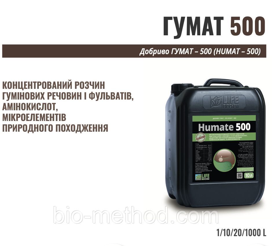 Humate 500 концентрат 10л – добриво з фульвовими та гуміновими кислотами, азотом, фосфором та мікроелементами.